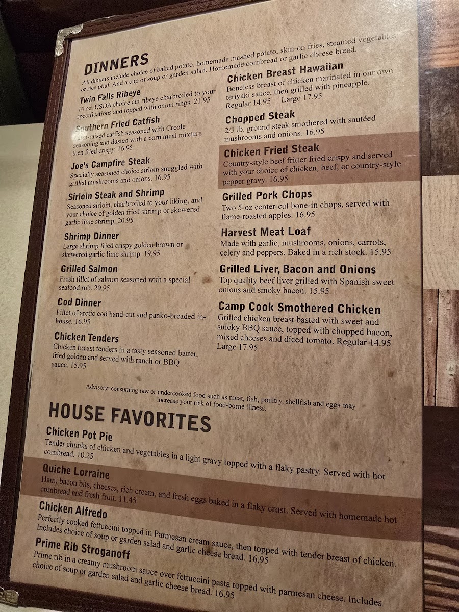 Fresh greens topped with fried chicken breast meat, cheeses, tomato, cucumber, black olives and sliced egg. Served with homemade cornbread or garlic cheese bread.